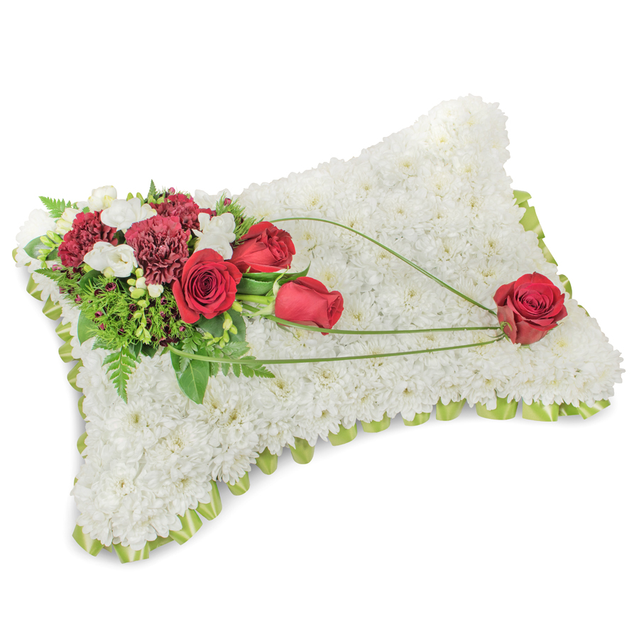 Express your deepest condolences with the Sincerest Sentiments Cushion from Flowers Leamouth. This elegant funeral cushion features a soft base of white chrysanthemums, thoughtfully accented with rich red roses, white freesias, dark red carnations, dianthus and graceful bear grass. Designed to convey comfort, love and respect, it makes a beautiful tribute for a funeral, memorial service or graveside farewell in Leamouth and the surrounding areas.