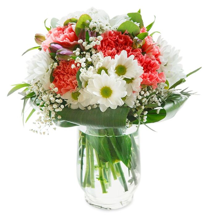 Overflowing with summery vibrance, this bouquet seems to capture the free-spirited essence of Leamouth, where the river bends meet creative urban life. Coral and fiery red carnations, soft and lively with their unique frilled petals, intertwine with pristine white daisies that shine with golden-green centers, infusing a sense of lightness akin to watching boats glide along the Thames. Dreamy tufts of white baby's breath meander throughout, their petite blooms lending gentle movement and ease. Slender, glossy foliage frames the base, hugging the arrangement like the protective greenery of urban pocket gardens. Tucked discreetly to the side, closed buds hinting at purple promise fresh beginnings-perhaps mirroring the artistic growth seen in local studios. Presented in a stylish white gift bag, the bouquet feels both refined and approachable, as if extending an invitation to celebrate a birthday, renew a friendship, or simply bring a moment of colour to a colleague's office in E16. The overall impression is one of cheery hospitality and modern elegance, crafted with thoughtful hands in the heart of Leamouth's vibrant community. Reflecting the waterside vibrancy and fresh optimism of Leamouth, this bouquet is a colourful celebration crafted with heartfelt local expertise. The clear white background enhances every vivid detail from above: at the heart are beaming white daisies whose bright-green centres spark a sense of renewal, while abundant coral-pink carnations with their feathery, ruffled layers add the warm embrace of summer's arrival. Ethereal baby's breath appears like constellation clusters, softening the arrangement and lending a gentle, dreamlike quality. Subtly nestled alstroemeria buds reveal fine strokes of purple and rose amid the greens, hinting at the next chapter of bloom. Framing it all is a medley of fresh silvery eucalyptus and deep green foliage, grounding the bouquet while introducing subtle fragrance and variety. The overall design feels open and lively, reflecting Leamouth's harmonious blend of tradition and contemporary style. Perfect for cheering up a friend, honouring an anniversary, or marking a birthday along the Thames, the bouquet embodies the cheerful spirit and craftsmanship of the neighbourhood-delivering not just flowers, but a true sense of connection to Leamouth and its community. There's a spirit of fresh beginnings and easy elegance in this bouquet-a sentiment familiar to those who stroll through Leamouth's vibrant riverside walkways. At its radiant heart, coral carnations unfurl in waves of soft, ruffled texture, each blossom aglow under natural daylight. Dancing around them, white daisies and plump chrysanthemums open cheerfully, their neat multi-petaled faces and yellow-green eyes giving off a sense of innocent optimism, reminiscent of wild blooms tucked beside the Thames. Threads of delicate white gypsophila weave through the bouquet, softening edges and invoking the airy charm of sea mist rolling in from Bow Creek. Broad, glossy green leaves surround the base, strengthening the bouquet with rich colour and a touch of organic structure, while slender greens reach upward like river grasses. The entire arrangement is set in a clear glass vase, where sturdy green stems are visible beneath the waterline-a nod to the freshness and quality of local flowers from Flowers Leamouth, lovingly delivered to homes across Orchard Place and Trinity Buoy Wharf. Marking special occasions or simply adding joy to the everyday, this bouquet invites the tranquil energy and creativity of Leamouth indoors, filling each space with a celebration of colour, texture, and local artistry.